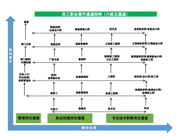 在員工職業(yè)發(fā)展通道上推行“六級五”通道。執(zhí)業(yè)技能人才、專業(yè)技術(shù)人才可走專業(yè)發(fā)展通道,也可走管理崗位、營銷序列與其他序列,為員工職業(yè)生涯發(fā)展提供廣闊的發(fā)展空間。